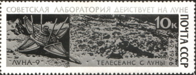 طابع بريدي يحمل رسماً للمسبار الأول الذي هبط بنجاح لونا 9، بجوار أول صورة لسطح القمر التي التقطتها المسبار.