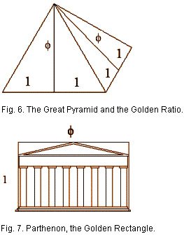 النسبة الذهبية φ هي النسبة الأكثر جمالاً. على امتداد تاريخ الفن والفنانين التقليدية اعتمدت على هذة كنسبة مقدسة في قياس الجمال. الهرم الأكبر في مصر يحتوي على هذه النسبة (شكل 6). في الأوراكل ديل - فاي الإغريقي . الخطوط العريضة للبارثينون في أثينا قرب الاكروبول محاطة بمستطيل ذهبي مؤلف من العديد من مستطيلات φ (الشكل 7).