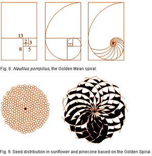 كواقع رياضي ، جميع الاشكال التي تنشأ عن طريق التوسع الميليّ(gnomonic expansion) تولد تقاطعات عليها يمكن بناء اللولب . ويمكن خلق دوامة من مستطيلات ذهبية (طول ضلع المستطيلات هو نسبي لل1 و φ ، أو لفترات متتالية في سلسلة فيبوناتشي) يمكن العثور عليها في مدى لا يحصى من الأماكن في لفائف ثعبان ، في جذع الفيل ، في القوقعة في الأذن الداخلية ، وفي وعاء pompilius نوتيلوس ، الذي نسبة لنفسه (الشكل 8).