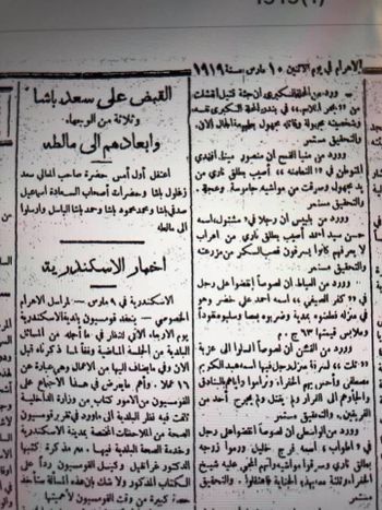 خبر القبض على سعد باشا وثلاثة من الوجهاء وابعادهم إلى مالطة، في ثلاث سطور في صفحة داخلية، الأهرام 10 مارس 1919.