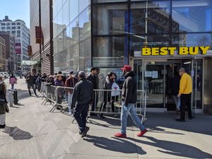 أدى جائحة الفيروس التاجي في الصين إلى زيادة عدد العاطلين عن العمل في المناطق الحضرية بمقدار 5 ملايين بين يناير وفبراير 2020.[52] في الأسبوع المنتهي في 21 مارس ، كان هناك 3.3 مليون مطالبات إعانة في الولايات المتحدة ، مقارنة بـ 282 ألفًا في الأسبوع السابق.[53][51]