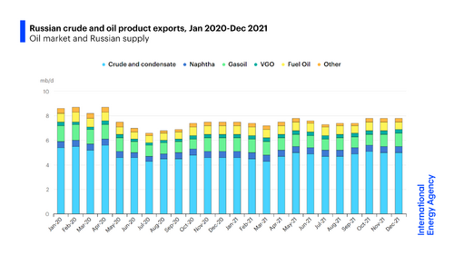 In January 2022, Russia produced 11.3 million barrels per day (Mb/d) of crude oil and condensate, of which 10Mb/d was crude oil. This makes Russia the world’s third largest producer of oil, surpassed only by the United States and Saudi Arabia (in the same period, they produced 17.6 Mb/d and 12 Mb/d, respectively). However, Russia is the largest exporter of oil products to global markets and the second largest exporter of crude, after Saudi Arabia. Russia exported 7.8 Mb/d in December 2021, including 5Mb/d of crude.[153]