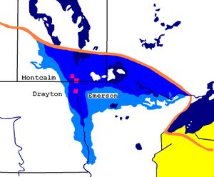 During the Emerson Phase, lake levels and drainage patterns continually fluctuated. The lake switched from a southward outlet to a northwestern outlet, and may have been static without a significant outlet during this phase. Isostatic rebound changed the elevation of the land, and this, combined with changes in the volume of meltwater from the ice margin and the closure of the Kaministikwia outlet in the east increased the size of the northern end of the lake.[1] One hypothesis postulates that the lake was a 'terminal lake' with water inflows and evapotranspiration being equal. Dating of the glacial moraines shows that the Clearwater and Athabasca River system and Lake Nipigon and Minong basin were still ice-covered. A period of precipitation and meltwater input balance with the rate of evapotranspiration may have existed for a short period of time.[1] During this phase, the Clearwater and Athabasca River system outlet opened. Isostatic rebound opened the southern outlet for a time, creating the Norcross (325 متر (1،066 ft)), Tintah (310 متر (1،020 ft)), and Upper Campbell (299 متر (981 ft)) beaches. The south outlet was permanently closed at the end of Emerson Phase.[1]