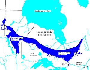 ![]() Map of the extent of Lake Agassiz in central North America, by 19th century geologist Warren Upham. The regions covered by the lake were significantly larger than shown here. | |