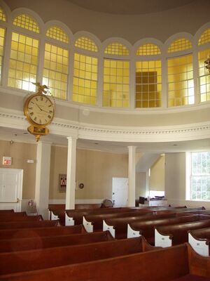 The Elijah Stearns Mansion is located in the heart of Bedford's Historic District and across from Wilson Park at 4 Great Road. Built by Stearns around 1800, it is a fine example of Federal architecture, which features brick ends, four chimneys and a doorway arched in glass and wrought iron. A carriage house is attached to the main house, and, until 1895, a structure which was known as The Boston Cash Store also resided on the property. It was the first store in the village at the time. It also became the first post office for the town when Elijah Stearns was appointed postmaster in 1825. Later, in 1867, the building became the Bedford Public Library. The building which housed the store, post office, and library has since been moved to 22 Loomis Street.[13] The home is part of the Bedford Center Historic District which was listed on the National Register of Historic Places in 1977.[14]