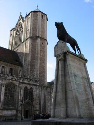 Up to the 12th century, Brunswick was ruled by the Saxon noble family of the Brunonids; then, through marriage, the town fell to the House of Welf. In 1142, Henry the Lion of the House of Welf became duke of Saxony and made Braunschweig the capital of his state (which, from 1156 on, also included the Duchy of Bavaria). He turned Dankwarderode Castle, the residence of the counts of Brunswick, into his own Pfalz and developed the city further to represent his authority. Under Henry's rule, the Cathedral of St. Blasius was built and he also had the statue of a lion, his heraldic animal, erected in front of the castle. The lion subsequently became the city's landmark.[بحاجة لمصدر]