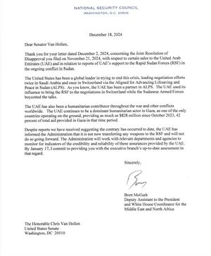 بحكم منصبه كمنسق لمجلس الأمن القومي لمنطقة الشرق الأوسط وشمال أفريقيا في عهد بايدن، كان مگرك مسؤولاً عن مراجعة الادارة لتسليح الإمارات لقوات الدعم السريع المتهمة بجرائم إبادة جماعية أثناء الحرب الأهلية السودانية. أصبح مگرك شريكاً في شركة مالية تدير أعمال في الإمارات والتقى طحنون بن زايد ضمن وفد الشركة لتنفيذ شراكات في مجال التقنية والذكاء الاصطناعي. الجدير بالذكر أن برت مگرك نفى تورط الإمارات في دعم الدعم السريع بخطاب رسمي إلى الكونگرس قبل أيام من إنتهاء فترة خدمته بالبيت الأبيض.