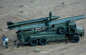 فجر 5:[204] هو صاروخ أرض-أرض ينتمي لعائلة صواريخ فجر، ويتراوح معدل مداه بين 68 و75 كيلومتراً.[205] ويمكن لصاروخ فجر-5 العمل في درجات حرارة من 40-50 درجة مؤية، وتصل السرعة القصوى للصاروخ 930 متر في الثانية الواحدة. يبلغ وزن الشاحنة التي تحمل الراجمة ذات ال12 فوهة، 15 طناً، وان أقصى زاوية إرتفاع لمدفع الراجمة +57 درجة، وزاوية الإنحراف نحو 90 درجة للجانبين. تجهز الوحدات المدفعية بهذا الصاروخ من أجل تغطية مساحة كبيرة نسبياً وفي وقت قصير من خلال نصب الراجمة على عربة لها قدرة كبيرة على التنقل بسهولة من أجل تعزيز قدرة الوحدات على التعامل مع التهديدات بالإضافة إلى تقليل نسبة إصابة هذه الوحدات من قبل أسلحة العدو. يشار إلى ان نوع الشاحنة التي يتم تثبيت راجمة صاروخ (فجر-5) عليها هي نفس تلك التي تُستَعمَل في صاروخ فجر-3، إلا ان راجمتها ذات 4 فوهات ولها قابلية الإرتفاع لـ 57 درجة والإنحراف بـ 45 درجة. يتميز صاروخ فجر-5 الذي يُطلَق من راجمة أُحادية الفوهة بأنه يعمل على مرحلتين، أي ان المرحلة الأولى تبدأ في بداية إنطلاق الصاروخ وبعد تسارع وارتفاع الصاروخ ينفصل هذا الجزء ويتولى الجزء الثاني في تحديد الصاروخ. وتمنح المرحلة الثانية الصاروخ سرعة هائلة ودقة كبيرة. ان الشاحنات التي تستقر عليها راجمات صواريخ فجر-3 وفجر-5 مجهزة بهوائيات للإتصالات من أجل إيجاد شبكة منسقة للراجمات للعمل بصورة موحدة من أجل خلق تنسيق وتعاون موحد بين هذه الراجمات. هذه الهوائيات تساعد على تعزيز التأثير العملاني للصواريخ والتوجيه الدقيق وبالتالي توزيع أفضل لحجم النيران في منطقة معينة والتنسيق بين غرف القيادة. هناك تطوير لهذه النوعية من الصواريخ بهدف زيادة مداها، ويتمثل بجعل المحرك من مرحلتين بدلاً من واحدة، وهذا التعديل زاد مدى الصاروخ ومحيط تدميره بشكل كبير. كما تم تجهيز هذا الصاروخ بنظام توجيه متطور حيث أصبح الصاروخ يعمل بنظام توجيه متطور يقفل الباحث فيه في المرحلة النهائية على الهدف المعادي الذي لايمكنه إطلاقاً التملص من إصابة الصاروخ. ان صاروخ فجر -5 يفتقد للزعانف الكبيرة على جانبيه، ولكن في المقابل تم نصب أجنحة صغيرة في نهاية الصاروخ، كما يلاحظ أيضاً في صواريخ فجر -4، وتساعد الزعانف الصغيرة التي تقع في المؤخرة على توازن الصاروخ . ولا تقتصر الصواريخ الإيرانية على صواريخ فجر، بل هناك أنواع أخرى ومنها صاروخ (فلق)، والذي يُطلَق من راجمات خاصة يتم تركيبها على شاحنات تكتيكية . الهيكل الخارجي لصارخ فلق-1 يشبه لحدٍ كبير الصواريخ قصيرة المدى من عيار 107 ملم والتي تتكون من هيكل إسطواني بدون أجنحة. اما الصواريخ بعيدة المدى من هذه العائلة مثل صاروخ آرش وفجر-3 وفجر-5 فإنها تمتلك في نهايتها أجنحة قابلة للطي، والتي تساعد على توازن الصاروخ عند الإطلاق.[195] اما السجل القتالي لصواريخ فجر 5، فقد قامت جمهورية إيران بدعم قوات حزب الله في لبنان في عام 2006م.[206] فخلال حرب تموز في 2006م أطلق حزب الله صواريخ إلى العمق الإسرائيلي. وقد أطلق حزب الله على هذه الصواريخ اسم خيبر-1.[207] خبراء متفجرات إسرائيلون يرجحون أن خيبر-1 عبارة عن نسخة مطورة من فجر-5.[208] كما وتم استخدام صواريخ فجر 5 خلال الحرب على غزة 2012م، حيث أطلقت حركة حماس وحركة الجهاد الإسلامي في فلسطين عدة صواريخ من نوع فجر-5 بإتجاه تل أبيب والقدس المحتلة.[209][210] اما بالنسبة لدولة سوريا، ففي 10 أيار/ مايو 2018م، أطلق فيلق القدس التابع للحرس الثوري الإيراني 20 صاروخاً على هضبة الجولان التي تحتلها إسرائيل من الأراضي السورية. وكانت صواريخ فجر 5 من ضمن هذه الصواريخ.[211] اما استخدام جمهورية العراق لصواريخ فجر 5 فقد حدث ذلك في عام 2015م، عندما أرسلت إيران صواريخ فجر 5 وأنظمة إطلاق إلى العراق لاستخدامها في الحرب العراقية ضد تنظيم الدولة الإسلامية. وأن الكمية المرسلة إلى العراق غير معروفة.[212] اما في جمهورية اليمن فقد ظهرت صواريخ فجر 5 عندما كشف الحوثيون عن صاروخ يشبه صاروخ فجر 5.[213]