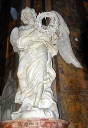 كان يمزج بين العمارة والنحت في كل مكان ، ويحلم بفن يجمع بين العمارة والنحت والتصوير في كل يستنهض الروح. وفي كنيسة سانتا ماريا دلا ڤيتوريا جميع قطع الرخام الثمين-الأخضر والأزرق والأحمر-وأطلق لخياله الزخرفي العنان ليبني مصلى الكورنارو، ذا الركائز المحززة والأعمدة الكورنثية الرشيقة، وقد أودعها أعظم تماثيله فتنة وحرارة، تمثال القديسة تريزا، منهكة القوى غائبة عن الوعي في نوبة من الوجد الصوفي، وملاك حلو يتأهب لشق قلبها بسهم ملتهب رمزا لاتحاد القديسة مع المسيح. ووجه تيريزا الذي يبدو كأن الحياة فارقته هو أحد انتصارات الباروك الإيطالي، والملاك الذي يريش سهمه ان هو إلا أغنية في الحجر.