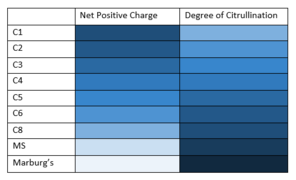 As implied by its name, myelin basic protein is significantly basic, with an isoelectric point of 10. It is thought to associate with the cell membrane through electrostatic interactions between its positive charges and negatively charged phospholipid heads of the plasma membrane.[14] It can undergo a large variety of post-translational modifications, creating various charge isomers known as C1-C6 or C8.[15] These modifications include phosphorylation, methylation, deamidation, citrullination, ADP-ribosylation, and N-terminal acylation . C1 is the least modified, while C8 is the most distinct, containing 6-11 additional citrullinations. Since each of these decreases its positive charge, C8 has the smallest net positive charge of the isomers. Alternations in these post-translational modifications have been associated with demyelinating diseases. Notably, MBP isolated from individuals with multiple sclerosis have had a higher degree of citrullination and a smaller positive charge. In a rare, severe form of MS known as Marburg's syndrome, the citrullination was even more extensive.[14]