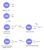 Cyanogen bromide is often used to immobilize proteins by coupling them to reagents such as agarose for affinity chromatography.[5] Because of its simplicity and mild pH conditions, cyanogen bromide activation is the most common method for preparing affinity gels. Cyanogen bromide is also often used because it reacts with the hydroxyl groups on agarose to form cyanate esters and imidocarbonates. These groups are reacted with primary amines in order to couple the protein onto the agarose matrix, as shown in the figure. Because cyanate esters are more reactive than are cyclic imidocarbonates, the amine will react mostly with the ester, yielding isourea derivatives, and partially with the less reactive imidocarbonate, yielding substituted imidocarbonates.[6]