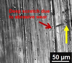 Deep 'groove' like surface indicates abrasive wear over cast iron (yellow arrow indicate sliding direction)