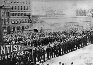 In 1864, the Great Fire of Brisbane burned through the central parts of the city, destroying much of Queen Street.[74] The 1860s were a period of economic and political turmoil leading to high unemployment, in 1866 hundreds of impoverished workers convened a meeting at the Treasury Hotel, with a cry for "bread or blood", rioted and attempted to ransack the Government store.[75]