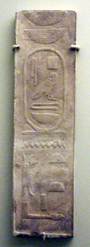 شظية من نقش حجري تحمل خرطوش الفرعون السايسي پسماتيك، بالهيروغليفية. معروضة في متحف اونتاريو الملكي، تورنتو.