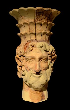 He has been identified with a solar deity,[6] although Yigael Yadin thought him to be a moon god.[10] Edward Lipinski identifies him with the god Dagon.[11] In Carthage and North Africa Baʿal Hammon was especially associated with the ram and was worshiped also as Baʿal Qarnaim ("Lord of Two Horns") in an open-air sanctuary at Jebel Boukornine ("the two-horned hill") across the bay from Carthage, in Tunisia.[12]