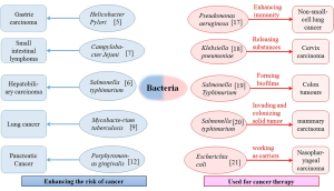 ارتبطت "السالمونيلا" المعوية بسرطان المرارة ولكنها قد تكون مفيدة أيضًا في تقديم عوامل العلاج الكيميائي لعلاج الورم الميلانيني وأورام القولون و[[سرطان المثانة] ]. [9] قد تكون البكتيريا الموجودة في الأمعاء مرتبطة بسرطان القولون ولكنها قد تكون أكثر تعقيدًا بسبب دور سرطانات المعززات الحيوية الوقائية الكيميائية.[15] العضيات الدقيقة ومنتجاتها الأيضية الثانوية، أو تأثير الاتهاب المزمن، قد تكون مرتبطة أيضًا بسرطان الفم.[16]