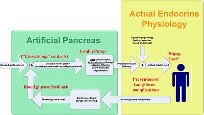 - وسيلة تعتمد المعدات الطبية باستخدام مضخة الأنسولين تحت تحكم بتغذية راجعة باستخدام البيانات في الوقت الحقيقي من حيث الاستشعار المستمر لجلوكوز الدم. هذه هي التكنولوجيا الناشئة، وسيكون هذا الموضوع هوالأكبر في هذه المقالة.