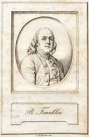 بنجامين فرانكلين FRS FRSA FRSE (إنگليزية: Benjamin Franklin، 17 يناير 1706 [ن.ق. 6 يناير 1705][Note 1] – 17 أبريل 1790)، هو كاتب وعالم ومخترع ورجل دولة ودبلوماسي وطابع وناشر وفيلسوف سياسي أمريكي رائد متعدد الثقافات.[1] كان فرانكلين من بين المثقفين الأكثر تأثيراً في عصره، وهو أحد الآباء المؤسسين للولايات المتحدة؛ ومحرر وموقع على إعلان الاستقلال؛ وأول مدير البريد العام.[2]