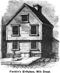 صورة التقطت في مايو 2008 لمسقط رأس فرانكلين في بوسطن، أُحيت ذكراه تمثال نصفي لفرانكلين فوق واجهة الطابق الثاني للمبنى.