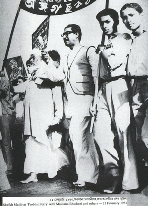 الشيخ مجيب الرحمن (الثالث من اليمين)، مؤسس بنگلادش ومولانا بهاشاني (الرابع من اليمين) في 1953.
