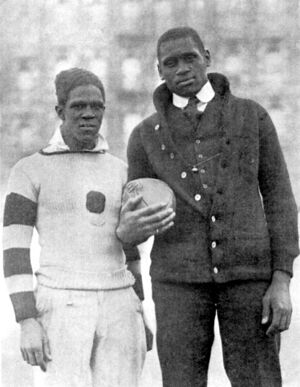 William found a stable parsonage at the St. Thomas A.M.E. Zion in 1910,[20] where Robeson filled in for his father during sermons when he was called away.[21] In 1912, Robeson began attending Somerville High School in New Jersey,[22] where he performed in Julius Caesar and Othello, sang in the chorus, and excelled in football, basketball, baseball and track.[23] His athletic dominance elicited racial taunts which he ignored.[24] Prior to his graduation, he won a statewide academic contest for a scholarship to Rutgers and was named class valedictorian.[25] He took a summer job as a waiter in Narragansett Pier, Rhode Island, where he befriended Fritz Pollard, later to be the first African-American coach in the National Football League.[26]
