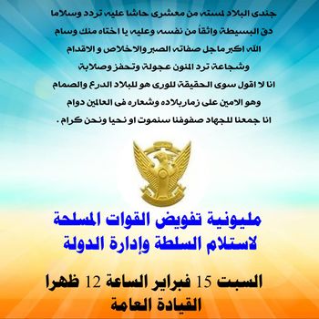 منذ فجر ثورة ديسمبر المبارك وسقوط النظام البائد ظلت القوات المسلحه السودانية تقوم بدورها الطليعي في حماية الأرض والعرض وحفظ والأنفس، وتأمين البلاد والعباد من شر مسطير كان سيلحق بها، وبعدها تكللت مساعي قواتكم الباسلة ومن معها من الأجهزة النظامية الأخرى من بسطت هيبتها وهيبة الدولة على كل مناحي الحياة إلى أن تم الإتفاق بينها وبين المنظومات السياسية الأخرى المتمثلة في (قوى الحرية والتغيير وتجمع المهنيين السودانيين) على إدارة أمر البلاد والعباد لفترة لا تتعدى الثلاث سنوات بتمثيل شرفي لقواتكم المسلحة.