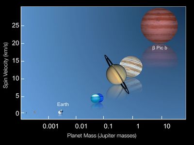 Plot of equatorial spin velocity vs mass for planets comparing Beta Pictoris b to the solar system planets. (ESO/I. Snellen (Leiden University))