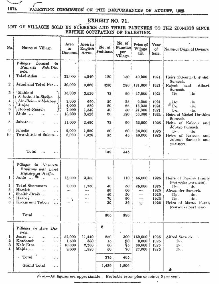 - ^ In 1925, according to List of villages sold by Sursocks and their partners to the Zionists since British occupation of Palestine, evidence to the Shaw Commission, 1930