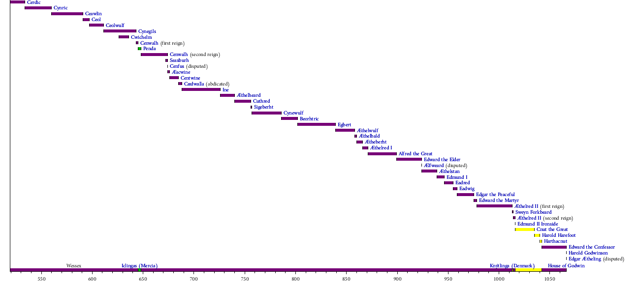 Edgar ÆthelingHarold GodwinsonEdward the ConfessorHarthacnutHarold HarefootCnut the GreatEdmund II IronsideÆthelred IISweyn ForkbeardÆthelred IIEdward the MartyrEdgar the PeacefulEadwigEadredEdmund IÆthelstanÆlfweard of WessexEdward the ElderAlfred the GreatÆthelred I, King of WessexÆthelberht of WessexÆthelbald of WessexÆthelwulf, King of WessexEgbert of WessexBeorhtric of WessexCynewulf of WessexSigeberht of WessexCuthred of WessexÆthelheard of WessexIne of WessexCædwalla of WessexCentwine of WessexÆscwine of WessexCenfus of WessexSeaxburh of WessexCenwalh of WessexPenda of MerciaCenwalh of WessexCwichelm of WessexCynegils of WessexCeolwulf of WessexCeol of WessexCeawlin of WessexCynric of WessexCerdic of WessexHouse of GodwinHouse of KnýtlingaIclingas