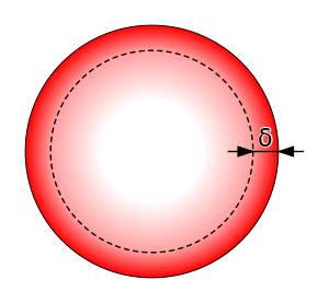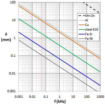 حيث يدل ro على نصف قطر السلك الناقل، ويدل r على بعد النقطة المعتبرة عن محور الناقل، ويدل Jo Eo على الحقل الكهربائي وكثافة التيار عند سطح الناقل. أما σ فيدل على عمق النفوذ أو ثخن قشرة الناقل ويساوي: