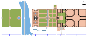 يحد مجمع تاج محل من ثلاث جهات أسوار جدرانية من الحجر الرملي الأحمر