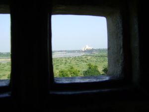 تاج محل كما يُرى من القلعة الحمراء في أگرا حيث اعتاد شاه جان رؤية ضريح زوجته المحبوبة خلال سنواته الأخيرة