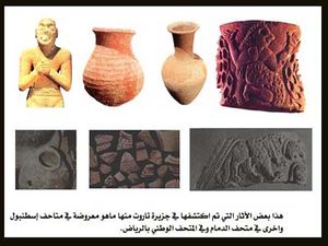 Many vessels have been found on Tārūt carved from steatite, particularly from Tell Rafī'ah; the designs are very artistic and include representations of cats, nude men, and motifs connected with the sea and fishing.[1] The source of the steatite was actually in South Western Persia, but the carving industry seems to have been a local one.[2]