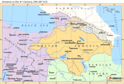 With the partition of Armenia in 387 by the Byzantines and Sassanids, the western half became part of the Byzantines known as أرمينيا البيزنطية، while the eastern (and much larger half) became a vassal state within the Sassanid realm.[43]