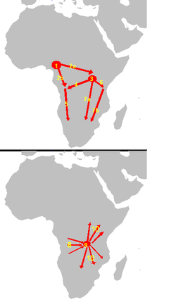 2.a = البانتو الشرقية،   2.b = البانتو الغربية