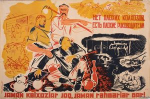 ملصق دعائي سوڤيتي باللغتين الروسية والاوزبكية (بحروف كيريلية) من عام 1933، يقول: