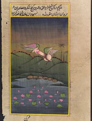 شاه عباس الأول وساقيه. رسم محمد قاسم، 1627. القصيدة المكتوبة "قد تمنحك الحياة كل ما تريد من ثلاث شفايف، واحدة من حبيبك، والثانية من النهر والثالثة من الكاس". اللوڤر، پاريس.