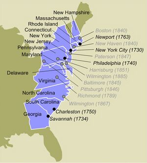 بعد أن استولى الإنجليز على نيو أمستردام وأصبحت تُسمَّى نيويورك (عام 1664)، وبعد تصفيتهم للجيـب الهـولندي في شـمال أمريكا، ازداد النشاط التجاري في هذا الجزء من العالم وبدأ اليهود يتجهون نحوه بشكل متزايد. ولم يحل عام 1700 إلا وكان هناك ما بين مائتي وثلاثمائة يهودي، ثم بلغ عددهم 2500 عام 1776. وكان معظم المستوطنين من الأثرياء. وقد ظل العنصر السفاردي (من إسبانيا والبرتغال) هو الغالب حتى عام 1720 حيث بدأ العنصر الإشكنازي (الألماني أساساً) يصبح غالباً. وهذا هو النمط الأساسي للاستيطان اليهودي في الغرب بعد القرن الخامس عشر إذ كان السفارد يشكِّلون دائماً النواة الأولى ثم يتبعهم الإشكناز حتى يصبحوا العنصر الغالب بكثافتهم البشرية. وقد تكونت جماعات يهودية في نيوبورت وفيلادلفيا ونيويورك وتشارلستون (في ساوث كارولينا) وأتلانتا (في جورجيا).