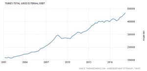 إلا أن أهم ما يميز الاقتصاد التركي في عهد أردوغان هو الارتفاع الحاد في الاقتراض الخارجي من البنوك الغربية، ودون الاعتماد على الاقتراض من صندوق النقد الدولي. فقد بلغ إجمالي الدين الخارجي لتركيا 112 مليار دولار حين تولى أردغان الوزارة في مارس 2002، ثم قفز هذا الدين إلى 421,434 مليار دولار في نهاية النصف الأول من عام 2016
