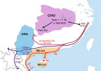 James R. Chamberlain (2016) proposes that Tai-Kadai (Kra-Dai) language family was formed as early as the 12th century BCE in the middle Yangtze basin, coinciding roughly with the establishment of the Chu and the beginning of the Zhou dynasty.[22] Following the southward migrations of Kra and Hlai (Rei/Li) peoples around the 8th century BCE, the Be-Tai people started to break away to the east coast in the present-day Zhejiang, in the 6th century BCE, forming the state of Yue.[22] After the destruction of the state of Yue by Chu army around 333 BCE, Yue people (Be-Tai) began to migrate southwards along the east coast of China to what are now Guangxi, Guizhou and northern Vietnam, forming Luo Yue (Central-Southwestern Tai) and Xi Ou (Northern Tai).[22] The Tai peoples, from Guangxi and northern Vietnam began moving south – and westwards in the first millennium CE, eventually spreading across the whole of mainland Southeast Asia.[23] Based on layers of Chinese loanwords in proto-Southwestern Tai and other historical evidence, Pittayawat Pittayaporn (2014) proposes that the southwestward migration of Tai-speaking tribes from the modern Guangxi and northern Vietnam to the mainland of Southeast Asia must have taken place sometime between the 8th–10th centuries.[2] Tai speaking tribes migrated southwestward along the rivers and over the lower passes into Southeast Asia, perhaps prompted by the Chinese expansion and suppression. Chinese historical texts record that, in 722, 400,000 'Lao'[أ] rose in revolt behind a leader who declared himself the king of Nanyue in Guangdong.[24][25] After the 722 revolt, some 60,000 were beheaded.[24] In 726, after the suppression of a rebellion by a 'Lao' leader in the present-day Guangxi, over 30,000 rebels were captured and beheaded.[25] In 756, another revolt attracted 200,000 followers and lasted four years.[26] In the 860s, many local people in what is now north Vietnam sided with attackers from Nanchao, and in the aftermath some 30,000 of them were beheaded.[26][27] In the 1040s, a powerful matriarch-shamaness by the name of A Nong, her chiefly husband, and their son, Nong Zhigao, raised a revolt, took Nanning, besieged Guangzhou for fifty seven days, and slew the commanders of five Chinese armies sent against them before they were defeated, and many of their leaders were killed.[26] As a result of these three bloody centuries, the Tai began to migrate southwestward.[26] A 2016 mitochondrial genome mapping of Thai and Lao populations supports the idea that both ethnicities originate from the Tai–Kadai (TK) language family.[28]