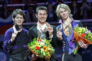 During a practice session at the Grand Prix Final, Kozuka inadvertently collided with Daisuke Takahashi.[15] Both were shaken but went on to compete at the event. Kozuka said, "I apologized to him and he accepted the apology with a smile and claimed that he was not in pain but I still feel awful about it. I promised him and his coach that it will never happen again."[16] Kozuka was fourth in the short program and second in the free skate, and won the bronze medal. He won his first national title in December 2010, placing first in both the short program and the free skate to total 251.93 points. At the 2011 World Championships, he placed sixth in the short program but moved to second overall after the long program and won his first World medal.