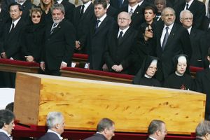 الرئيس تشن شوي بيان (أقصى اليسار) أثناء مشاركته في جنازة الپاپا يوحنا پولس الثاني جالساً في الصف الأول حسب الترتيب الأبجدي الفرنسي بجانب السيدة الأولى ورئيس البرازيل في ذلك الوقت.