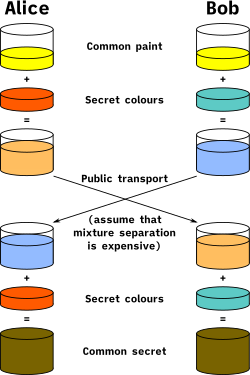 يُنشئ تبادل مفاتيح ديفي-هلمان سراً مشتركاً بين طرفين يمكن استخدامه للاتصال السري لتبادل البيانات عبر شبكة عامة. يوضح القياس مفهوم تبادل المفتاح العام باستخدام الألوان بدلاً من الأرقام الكبيرة جداً:
