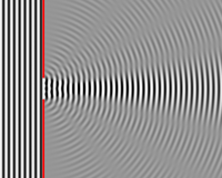 أي أن الشدة في هذه النقاط ضعيفة (بل تكون معدومة في حال كانت ) وهذا هو التداخل الهدّام destructive interference ويظهر على الشاشة بشكل أهداب مظلمة تتناوب مع الأهداب المضيئة لتشكل كلها ما يسمى بأهداب التداخل.