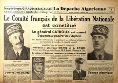 The French Committee of National Liberation was a provisional government of Free France formed by generals Henri Giraud and Charles de Gaulle to provide united leadership, and organize and coordinate the campaign to liberate France. The committee was formed on 3 June 1943 and after a period of joint leadership came under the chairmanship of de Gaulle on 9 November.[50] The committee directly challenged the legitimacy of the Vichy régime and unified the French forces that fought against the Nazis and their collaborators. The committee functioned as a provisional government for French Algeria (then a part of metropolitan France) and the liberated parts of the colonial empire.[51][52][53]