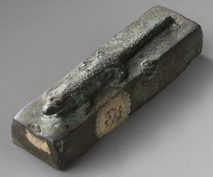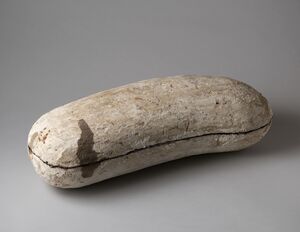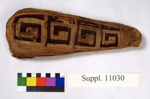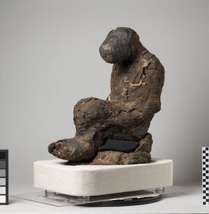 Cattle mummy representing a seated animal. The head is lifelike, while the body is rendered as a rough trapezoid. The head and forepart of the body are covered in a dark brown fabric, while the rest of the animal is covered with an undyed cloth. Underneath the undyed cloth, several other textile fabrics have been used as a stuffing.[35]