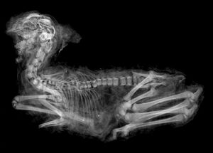 Radiography of the baboon mummy. The animal is wrapped in a variety of linens. They are for the most part hidden under a coating of resinous substances, thus only some fabrics can be identified. They are visible through gaps at the shoulder, arms, and knees.[22]