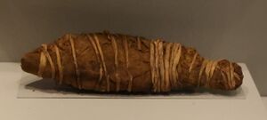 Egyptians believed that the afterlife would be a continuation of this one, allowing for the transportation of items from this life to the next.[10] In order to bring food to the afterlife, Egyptians would surround human mummies by what are known as victual mummies, made of edible animals.[11] These animals were prepared by dehydrating the meat and wrapping it in linen bandages, which indicated that the animals were food, not pets.[11] The victual animals were not mummified to the same meticulous extent that a pet or human would be, but they were nonetheless carefully preserved using natron and other special salts.[11] This food was included in tombs in order to sustain the deceased person's soul, called the ka, during the journey to the next world.[10] A variety of food has been found in many tombs, mostly breads, meats, and fowl.[10] King Tutankhamun's tomb held several coffin-shaped wooden boxes containing victual mummies, in his case duck and other types of meats.[10]