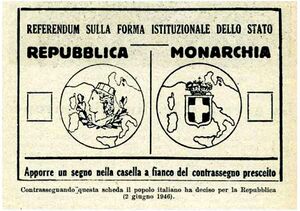 The aftermath of World War II left Italy with an anger against the monarchy for its endorsement of the Fascist regime for the previous twenty years. These frustrations contributed to a revival of the Italian republican movement.[26] In the 1946 Italian constitutional referendum, held on 2 June, a day celebrated since as Festa della Repubblica, the Italian monarchy was abolished, having been associated with the deprivations of the war and the Fascist rule, especially in the North, and Italy became a republic. This was the first time that Italian women voted at the national level, and the second time overall considering the local elections that were held a few months earlier in some cities.[27][28]