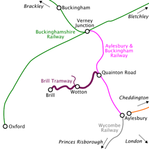 Railways in and around the Aylesbury Vale, 1910–35. Two of the new routes crossed the Tramway, but neither was connected to it. The Tramway's only significant passenger markets at Brill and Wotton were both served by stations on the new lines.[note 1]